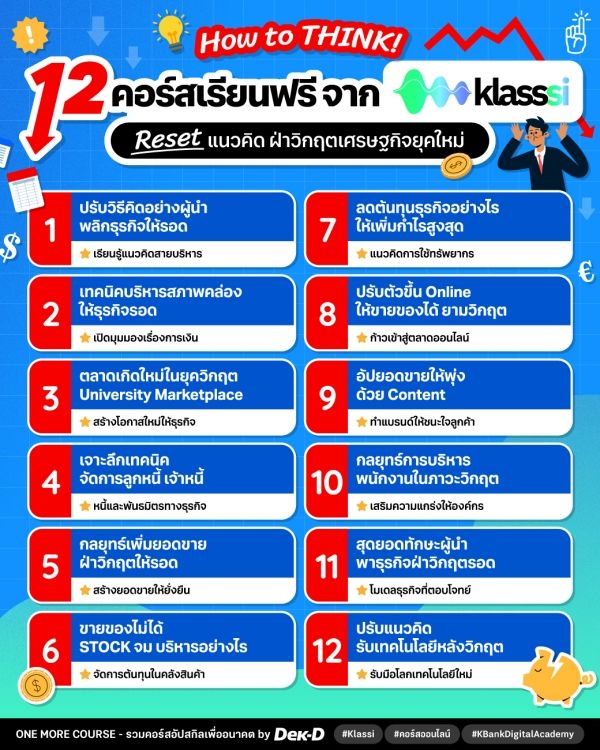 วันนี้ One More Course ขอแวะมาแปะพิกัด 12 คอร์สเรียนฟรีจาก Klasssi #ธนาคารกสิกรไทย ที่จะช่วยอัปสกิล ‘Crisis Management’ โดยรวมองค์ความรู้และทักษะในการจัดการกับภาวะวิกฤต เสิร์ฟข้อมูล insights จากผู้ประกอบการและตัวจริงในหลากหลายแวดวง ทั้งด้านการเงิน การขาย การบริหาร และเทคโนโลยี // แต่ละคอร์สจะมีรายละเอียดอะไรบ้าง ไปดูรายเอียดด้านล่างได้เลยย
