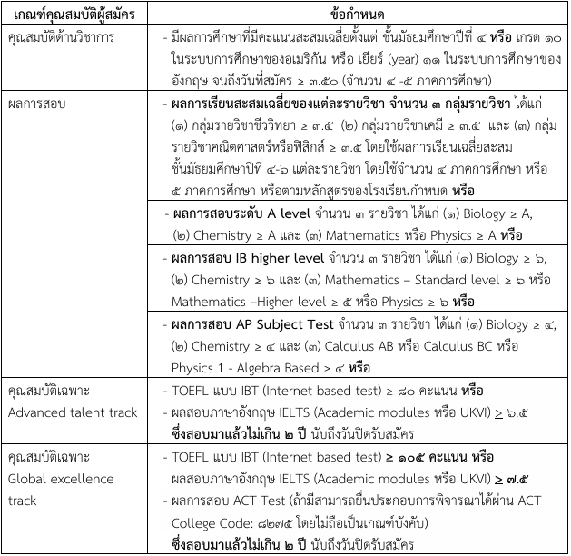 - GPA 3 กลุ่มรายวิชา (ชีววิทยา, เคมี, คณิต/ฟิสิกส์) แต่ละกลุ่ม ไม่ต่ำกว่า 3.50