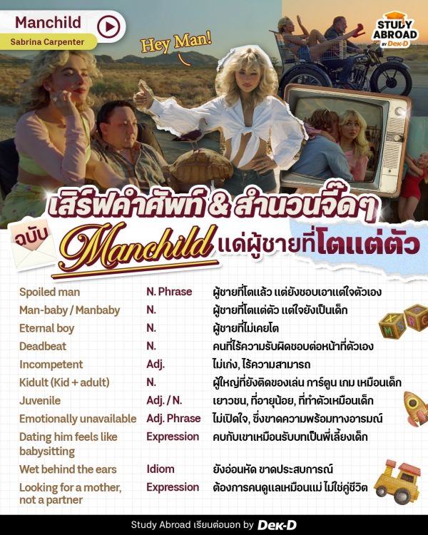 วันนี้ พี่ลูกหมู และ #แจกศัพท์ฉบับเด็กนอก เลยขอมาเสิร์ฟคลังศัพท์ & สำนวนภาษาอังกฤษจี๊ดๆ ที่มีความหมายคล้าย ‘Manchild’ ฉบับความรักที่ไม่ใช่โรแมนติก แต่คือภารกิจเลี้ยงเด็กโต ลิสต์จุกๆ มาให้ทุกคนที่กำลังอินได้จดไปใช้กัน จะมีคำไหนและประโยคเด็ดๆ อะไรบ้าง มาดูพร้อมกันด้านล่างนี้เล้ยย~