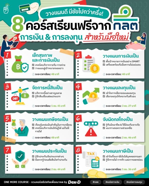 [Must-have skill] “อิสรภาพทางการเงิน” ไม่ได้วัดจากตัวเลขในบัญชี แต่ต้องบริหารจัดการให้ดีด้วย! วันนี้ One More Course ขอแวะมาป้ายยา 8 #คอร์สฟรี ในซีรีส์ “หลักสูตรต้นแบบความรู้การเงินการลงทุน” จาก สำนักงานคณะกรรมการกำกับหลักทรัพย์และตลาดหลักทรัพย์ (ก.ล.ต.) // มัดรวมเรื่อง #การเงิน #การลงทุน ที่ควรรู้ก่อนตอนนี้ ดีกว่ารู้งี้ทีหลัง ช่วยสร้างภูมิคุ้มกันให้สุขภาพทางการเงินแข็งแรง และตัดสินใจลงทุนได้อย่างมีเป้าหมาย จะมีคอร์สอะไรบ้าง ตามไปเช็กเลย!