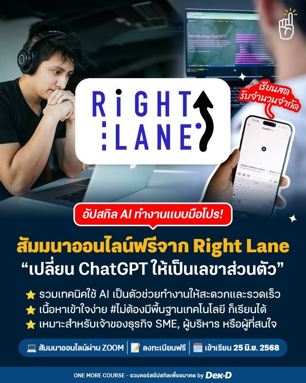 ยุคนี้ทุกอย่างเน้นความฉับไว และมี AI เข้ามามีบทบาทในการทำงาน และสำหรับใครที่อยาก upskill ไม่ให้ตกขบวน วันนี้ One More Course มีสัมมนาออนไลน์ฟรี หัวข้อ “สร้างเลขาส่วนตัว มาช่วยงานแบบง่ายๆ ด้วย ChatGPT” ที่เสิร์ฟโดย Right Lane มาบอกต่อทุกคน!