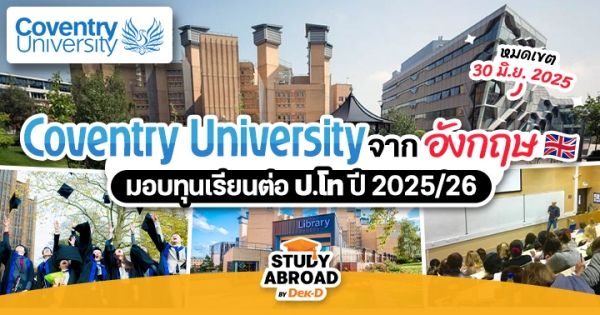 สวัสดีชาว Dek-D ทุกคนค่าา~ สำหรับน้องๆ ที่สนใจเรียนต่ออังกฤษในปี 2026 ล่าสุด ‘Coventry University’ มหาวิทยาลัยเก่าแก่ของอังกฤษ กำลังเปิดรับสมัครนักศึกษา ป.โท หลากหลายสาขา พร้อมมีทุนส่วนลดมอบให้นักเรียนต่างชาติ ซึ่งตอนนี้ก็เข้าสู่โค้งสุดท้ายของการสมัครแล้วค่ะ ใครไม่อยากพลาดโอกาสเรียนต่อมหา’ลัยคุณภาพ มีบรรยากาศที่รายล้อมไปด้วยประวัติศาสตร์ และค่าครองชีพไม่แพงเท่าเมืองใหญ่ๆ รีบเลื่อนลงมาเช็กรายละเอียดกันเลย!