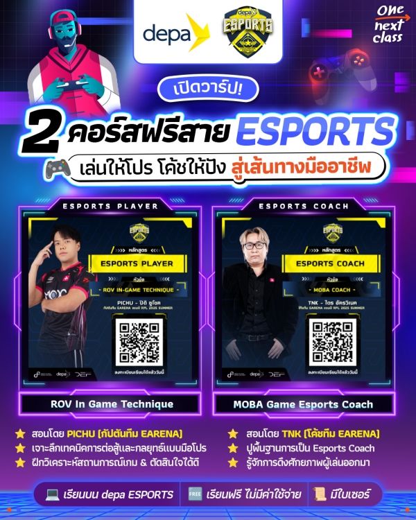 ️ ขอเอาใจ #สายเกมเมอร์ และใครที่สนใจเทิร์นสู่วงการ Esports ! วันนี้ One Next Class #ชีวิตติดเรียนรู้ ขอมาเปิดวาร์ป 2 คอร์สออนไลน์ #เรียนฟรี ส่งตรงจาก depa Thailand ที่ได้เชิญผู้เชี่ยวชาญด้านอีสปอร์ตอย่างกัปตันและโค้ชจากทีม EARENA แชมป์ RPL 2025 SUMMER มาสอนเองกับมือ พร้อมแชร์เทคนิคแบบไม่มีกั๊ก!