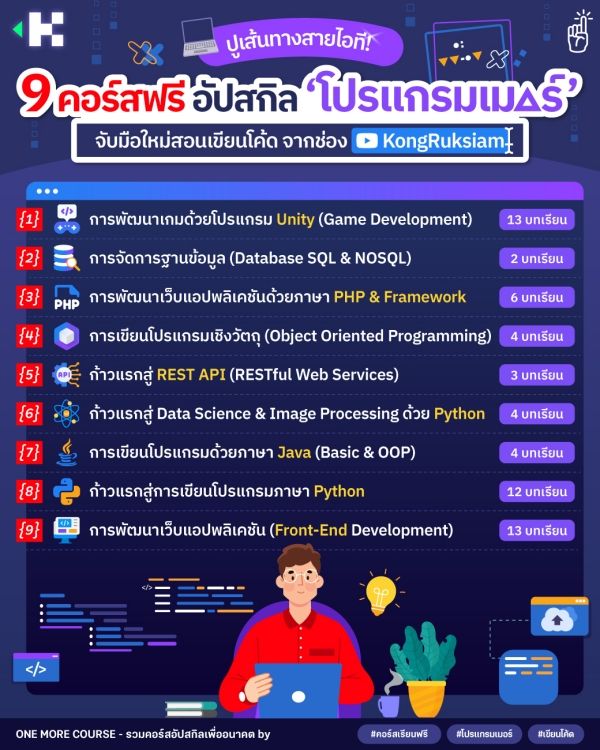 มือใหม่ที่อยากฝึก #เขียนโค้ด หรือใครที่อยากปัดฝุ่นสกิลสาย Tech เพิ่มโอกาสในตลาดงานยุคใหม่ วันนี้ One More Course ได้รวมลิสต์ 9 คอร์สเรียนฟรีจากช่อง KongRuksiam ที่จะช่วย unlock skill การเขียนสายโปรแกรมเมอร์แบบครบเครื่อง เช่น Python, Java, Front-End, Full-Stack Web Development, Game Development, SQL, Data Science และอีกมากมายหลายหัวข้อน่าสนใจ