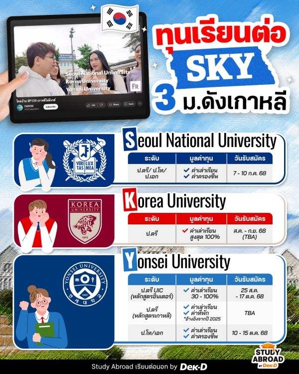 มีใครได้ดูรายการ ไกลบ้าน EP129 ที่พาไปเยือนกรุงโซล ประเทศเกาหลีกันบ้าง? โดยดาราช่องในตอนนี้อย่าง ‘คุณต๊ะ’ นักเรียนทุนรัฐบาลเกาหลี ได้เล่าถึง SKY ซึ่งเป็นการเรียกรวมชื่อของ 3 มหาวิทยาลัยที่มีชื่อเสียงที่สุดในประเทศ ได้แก่ Seoul National University, Korea University และ Yonsei University (หรือจะเรียกว่าเป็น Ivy League ของเกาหลีก็ว่าได้!)