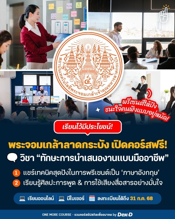 พรีเซนต์งานเป็นภาษาอังกฤษยังไง ให้มัดใจคนฟังแบบอยู่หมัด? ตามมาหาคำตอบในคอร์สนี้เลย! ล่าสุด KLIX จาก สถาบันเทคโนโลยีพระจอมเกล้าเจ้าคุณทหารลาดกระบัง (KMITL) เสิร์ฟคอร์สเรียนฟรี วิชา “Professional Communication and Presentation” ที่จะพาไปเรียนรู้เทคนิคการสื่อสาร นำเสนอผลงานให้ดูโปร บอกเลยใครต้องพรีเซนต์งาน สรุปประชุม หรือ Pitching ขายงานบ่อยๆ แนะนำให้ upskill & reskill ไว้เลย~
