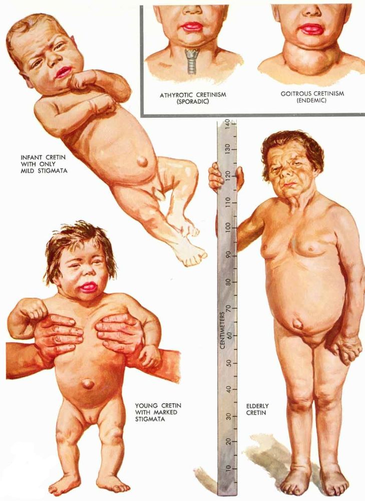 วัยเด็ก : ร่างกาย และสมองจะเจริญน้อยลง ลักษณะของร่างกายจะเตี้ยแคระ แขนและขาสั้น ผิวหยาบแห้ง ผมบาง ฯลฯ จะเรียกกลุ่มอาการนี้ว่า เครทินิซึม