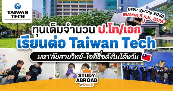 你好 สวัสดีชาว Dek-D ทุกคนค่า~ ต้องบอกเลยว่าช่วงนี้เป็นโอกาสทองของ #ทีมไต้หวัน เลยก็ว่าได้ เพราะหลายมหาวิทยาลัยกำลังเปิดรับกันรัวๆ เลยค่ะ และหนึ่งในนั้นก็คือ ‘National Taiwan University of Science and Technology’ หรือ ‘Taiwan Tech’ มหาวิทยาลัยลัยวิจัยประยุกต์ชั้นนำในไทเป ที่ขึ้นชื่อทั้งด้านวิศวกรรมและเทคโนโลยี กำลังเปิดรับสมัครนักศึกษาใหม่ระดับ ป.โท/เอก เพื่อเข้าเรียนในเทอม Spring 2026 และมีทุนสูงสุดเต็มจำนวนให้ด้วย ใครอยากเช็กอินดินแดนชานมไข่มุก ที่ขึ้นชื่อในสายวิทย์-ไอที รีบตามไปอ่านรายละเอียดด้านล่างกันเลยค่า~