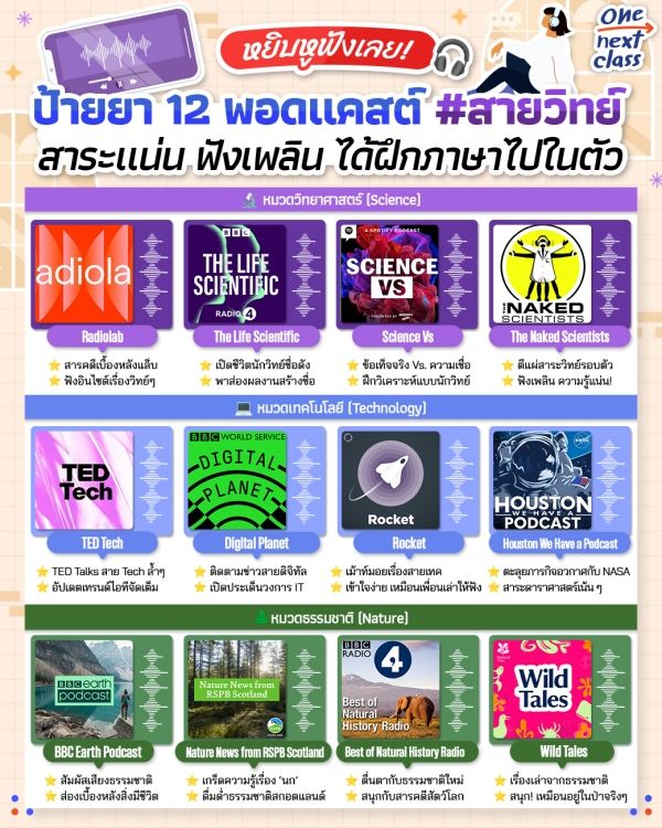 และสำหรับใครที่อยากเติมความรู้วิทย์ๆ แต่ไม่มีเวลาอ่าน textbook หรือ research เล่มหนาๆ วันนี้ One Next Class #ชีวิตติดเรียนรู้ เลยขอแวะมาป้ายยา 12 พอดแคสต์สาระวิทย์ดีๆ ให้ทุกคนเซฟไว้ฟังกันเพลินๆ แต่ได้สาระแน่นๆ ลิสต์มาให้ทั้ง หมวดวิทยาศาสตร์ หมวดเทคโนโลยี และหมวดธรรมชาติ บอกเลยว่าแต่ละรายการน่าสนใจมาก แถมยังได้ #ฝึกภาษาอังกฤษ และเก็บคลังคำศัพท์เฉพาะทางไปในตัวด้วยนะ // ยิ่งใครที่กำลังเตรียมสอบ IELTS อยู่คือแนะนำมากๆ~