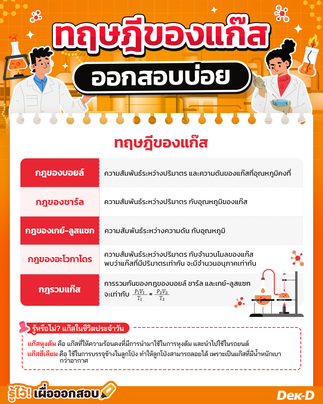สวัสดีค่ะ สำหรับคอลัมน์ “รู้ไว้เผื่อออกสอบ” วันนี้พี่มีวิชาเคมีมาฝากน้อง ๆ ชาว Dek-D กันค่ะ และวันนี้เรามาพบกันในเรื่อง “แก๊สและสมบัติของแก๊ส” เป็นอีกเรื่องที่พบได้บ่อยในข้อสอบ วันนี้พี่จะพาน้อง ๆ มาทำความเข้าใจเกี่ยวกับแก๊ส และกฎต่าง ๆ ของแก๊สว่ามีอะไรบ้าง