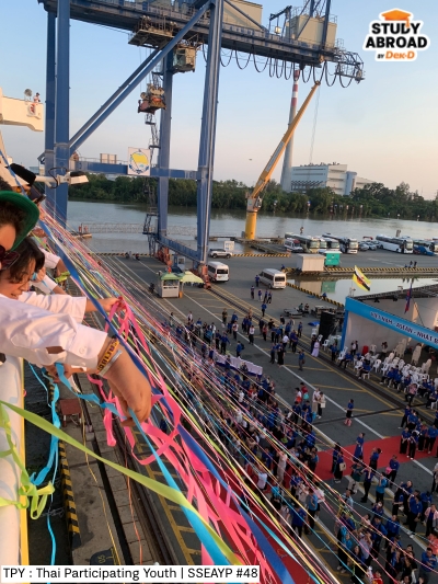 และหนึ่งในกิจกรรมที่ตราตรึงใจที่สุดคือ การโยนริบบิ้นจากบนเรือให้ Host Family ด้านล่าง ตอนเรือแล่นออก ริบบิ้นก็ค่อยๆ ขาด เหมือนสื่อถึงการจากลา มันทั้งสวยงาม ทั้งเศร้า และไม่มีวันลืมเลยค่ะ