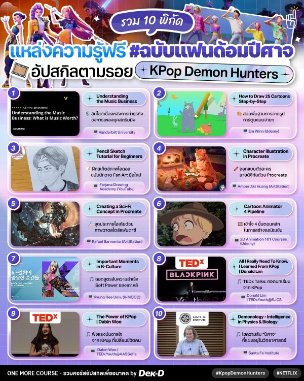ในนี้จะมีตั้งแต่คอร์ส Music Marketing, คอร์สวิเคราะห์วงการเพลงแบบอินไซต์, ปูพื้นฐานวาดภาพสำหรับมือใหม่, สอนวาด Fan Art, การสร้างแอนิเมชัน, เปิดสูตรสำเร็จวงการ KPop ไปจนถึงความรู้เข้มข้นเกี่ยวกับ ‘Demonology’ หรือ #ปีศาจวิทยา ซึ่งเป็นคอนเซ็ปต์ในหนังเรื่องนี้ // บอกเลยว่า KPop Demon Hunters ไม่ใช่แค่แอนิเมชัน แต่เป็นปรากฏการณ์ที่เชื่อมโยงศิลปะ วัฒนธรรม และองค์ความรู้ไว้ด้วยกันอย่างคาดไม่ถึง!