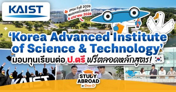안녕! วันนี้ขอเอาใจน้องๆ ชาว Dek-D #สายวิทย์ ที่กำลังมองหาทุนเรียนต่อต่างประเทศในปีหน้า ตอนนี้สถาบันสายวิทย์และเทคโนโลยีชื่อดังในเกาหลีใต้อย่าง ‘KAIST’ ใกล้เปิดรับสมัครนักศึกษาใหม่ประจำปี 2026 แล้วค่ะ ขอบอกว่าผู้สมัครทุกคนมีโอกาสได้ทุนเรียนฟรีตลอดหลักสูตรด้วย รายละเอียดของเอกสารสมัครเรียนในปีนี้เปลี่ยนแปลงจากปีก่อนค่อนข้างเยอะ รีบเลื่อนอัปเดตข้อมูลกันเลยค่ะ~