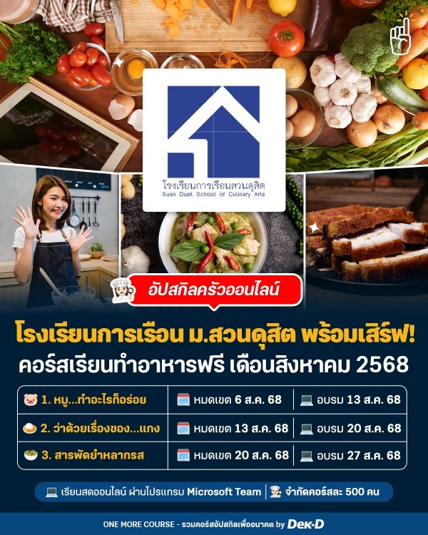 - สอบถามรายละเอียดเพิ่มเติมที่ Facebook: โรงเรียนการเรือนมหาวิทยาลัยสวนดุสิต