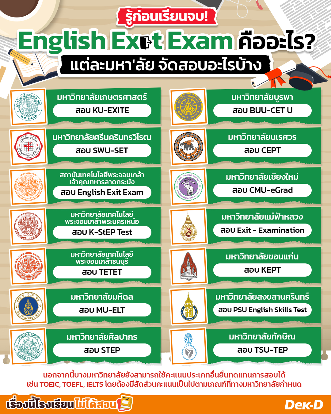 ข้อมูลจากhttps://mustudent.mahidol.ac.th/2023/06/30821/https://registrar.ku.ac.th/kuexite https://kept.kku.ac.th/web/pages/abouthttps://kept.kku.ac.th/web/pages/certhttps://www.facebook.com/CMUeProeGrad/posts/-https://www.reg.cmu.ac.th/webreg/reg-news/REG-NEWS-3-19-TH.pdfhttps://www.chulatutor.com/blog/cept/https://www.sc.su.ac.th/sc_new/630310_STEP.pdfhttps://sola.pr.kmutt.ac.th/testing/th/tetet/tetet/https://www.kmitl.ac.th/article/english-exit-examhttps://www.reg.kmitl.ac.th/uploads/PDF_2020-11-26_14-43-58_Jr13xQ.pdfhttps://www.facebook.com/photo.php?fbid=637151042371141&id=100082287532721&set=a.136748685744715https://lc.tsu.ac.th/upload/menu/doc_20240604_165148.pdfhttps://reg.mfu.ac.th/th/announcement/exit-examinationhttps://buuli.buu.ac.th/languagestest/detail.php?id=2https://eila.psu.ac.th/psu-est-mock-exam/?https://acdserv.kmutnb.ac.th/wp-content/uploads/2021/03/exit_exam_2.pdf