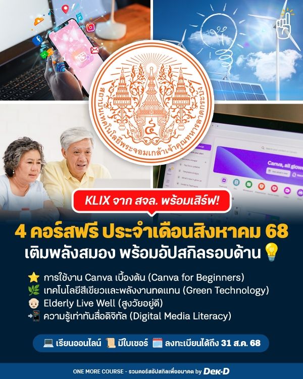 มาแล้ว! คอร์สดีเรียนฟรีจาก สจล. ประจำเดือนสิงหาคม สำหรับใครที่กำลังมองหาแหล่งเรียนเพื่ออัปสกิลอยู่ ล่าสุด KLIX แพลตฟอร์มออนไลน์จากสถาบันเทคโนโลยีพระจอมเกล้าเจ้าคุณทหารลาดกระบัง (KMITL) กลับมาพร้อม 4 คอร์สสุดปัง เสิร์ฟความรู้แบบวาไรตี้ เอาใจสายครีเอทีฟ สายสิ่งแวดล้อม สายสุขภาพ และสายดิจิทัล พร้อมมีใบเซอร์ให้ด้วย! // ลงทะเบียนฟรีถึงสิ้นเดือนนี้เท่านั้นใครเล็งคอร์สไหนไว้ รีบเลยยย~
