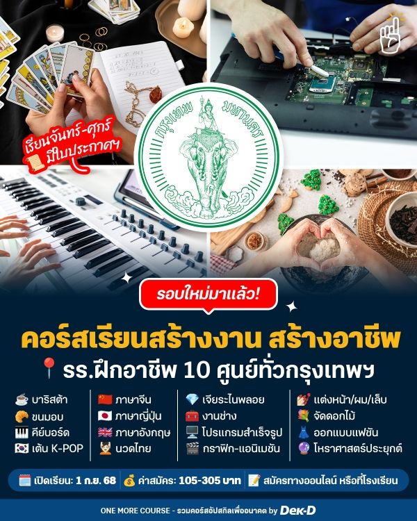 รอบนี้ก็จัดเต็มสายงานน่าเรียนมากมาย แถมค่าเรียนแต่ละหลักสูตรคือดีมาก เริ่มต้นเพียง 105 บาทเท่านั้น ใครมีเวลาว่างจันทร์-ศุกร์ และอยากเรียนรู้เพื่อสร้างอาชีพให้ตัวเอง รีบตามมาอ่านรายละเอียดทั้ง 10 ศูนย์ในกรุงเทพฯ ที่ One More Course ได้สรุปมาให้กันเลย~ #บางคอร์สเต็มเร็วมากกก
