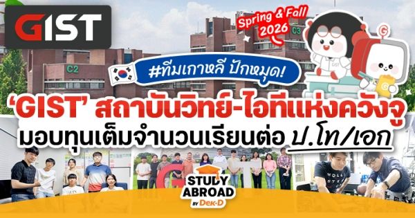 안녕! สำหรับชาว Dek-D ที่กำลังมองหาทุนเรียนต่อในสาขาด้านวิทยาศาสตร์และเทคโนโลยี ไม่ว่าจะเป็น AI, วิศวกกรมศาสตร์, ชีวการแพทย์ ฯลฯ วันนี้พี่พลอยกี้มีข่าวการรับสมัครนักศึกษาใหม่ระดับ ป.โท และ ป.เอก ที่ ‘Gwangju Institute of Science and Technology’ หรือ ‘GIST’ ในปี 2026 มาฝาก ขอบอกว่าผู้สมัครทุกคนมีโอกาสได้ทุนเต็มจำนวน ครอบคลุมค่าเล่าเรียน, ค่าครองชีพ และสิทธิประโยชน์อื่นๆ อีกเพียบ! ใครไม่อยากพลาดโอกาสดีๆ แบบนี้ รีบเลื่อนไปศึกษารายละเอียดของเทอมนี้กันเลยค่ะ~