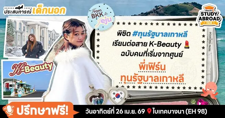 Note: เตรียมพบ "พี่เฟิร์น" และอีก 20+ รุ่นพี่นักเรียนทุนดีกรี Top U ทั่วโลก ที่ให้เกียรติมาประจำบูทใหญ่ในงาน Dek-D’s Study Abroad Fair เพื่อแชร์อินไซต์และให้คำปรึกษาแบบ 1:1 โดยไม่มีค่าใช้จ่าย ในวันเสาร์ที่ 25 และอาทิตย์ที่ 26 เมษายน 2026 ที่ BITEC Bangna (EH98) จัดร่วมกับงาน Dek-D’s TCAS Fair // ไม่ต้องลงทะเบียนล่วงหน้านะคะ เล็งคิวรุ่นพี่ให้ถูกวันแล้ว Walk-in ได้เลย (พี่ๆ ใจดีมากกก)