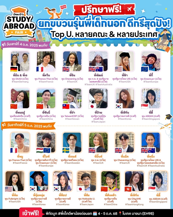 จดคำถามที่คาใจ แล้วมาคุยแบบ 1:1 กับ "พี่ท็อป" ตัวจริงได้ในวันอาทิตย์ที่งาน Dek-D's Study Abroad Fair นะคะ รอบนี้เราได้รับเกียรติจาก 24 รุ่นพี่เด็กนอกหลายทุน หลายประเทศ ได้แก่ ทุนรัฐบาลไทย ก.พ. และ ทุน UIS, CSC (จีน), GKS (เกาหลีใต้), ASEAN Scholarships (สิงคโปร์), TaiwanICDF (ไต้หวัน), MEXT (ญี่ปุ่น), DAAD (เยอรมนี), Franco-Thai (ฝรั่งเศส), Fulbright TGS (สหรัฐฯ), Chevening (สหราชอาณาจักร), Erasmus+ (ยุโรป), Swedish Institute (สวีเดน), Stipendium Hungaricum (ฮังการี), Australia Awards (ออสเตรเลีย), และทุนจากมหาวิทยาลัย/บริษัทเอกชน