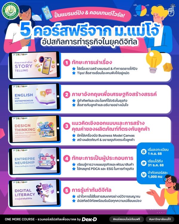 วันนี้ One More Course เลยขอมาเปิดพิกัด 5 คอร์สเรียนออนไลน์ฟรีจาก #มหาวิทยาลัยแม่โจ้ ที่ได้เปิดหลักสูตรดีๆ อย่าง “พัฒนาทักษะผู้ประกอบการและนักสร้างคอนเทนต์” ซึ่งรวบตึงความรู้และทักษะจึ้งๆ มาให้ upskill & reskill กันแบบจุใจ จะลงเรียนกี่คอร์สก็ได้ แต่ต้องเรียนให้จบภายใน 31 ธ.ค. 68 พร้อมทำคะแนนให้ผ่านเงื่อนไข ก็รับไปเลย #ใบเซอร์ จาก ม.แม่โจ้