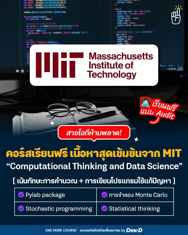 ยุคนี้สายงาน Data Science ยังคงมาแรงอย่างต่อเนื่อง สำหรับใครที่พอจะมีพื้นฐานสายไอที หรือความรู้เกี่ยวกับ Python และอยากต่อยอดความรู้ไปอีกเลเวล วันนี้ One More Course ขอมาเปิดวาร์ปคอร์สเรียนฟรีจาก MIT ท็อปยูอันดับหนึ่งของโลก ที่ได้เปิดรายวิชา “Introduction to Computational Thinking and Data Science” เสิร์ฟเนื้อหาครอบคลุมและเข้มข้น สอนโดย Expert เหมือนเรียนในคลาสจริง