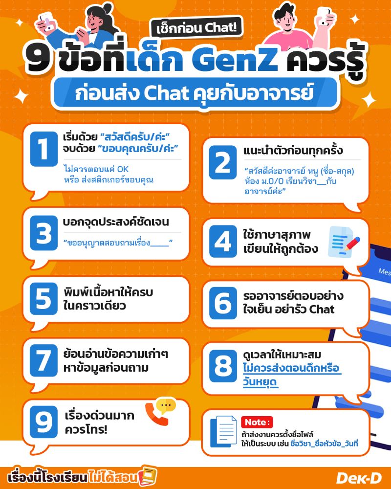 เพียงแค่ทำตาม 9 ข้อนี้ง่ายๆ การส่งข้อความ chat ถึงอาจารย์ของเราก็จะดูเป็นมืออาชีพ และดูอ่อนน้อมมากขึ้นด้วย แต่ถ้าน้องๆ หรืออาจารย์คิดว่ายังมีข้อไหนที่ควรระวังอีก ก็คอมเมนต์บอกกันได้เลยนะคะ