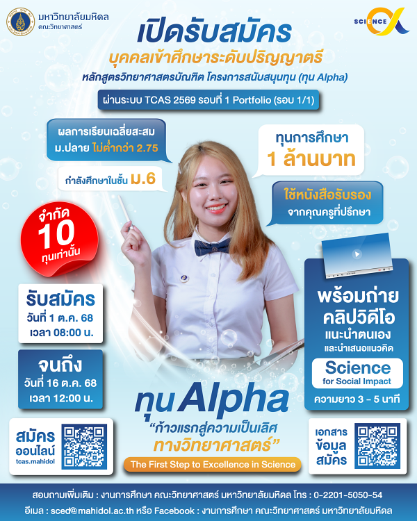 คณะวิทยาศาสตร์ ม.มหิดล TCAS69 เปิดรับสมัครทุน Alpha 1 ล้านบาท สำหรับ ม.6 ที่รักวิทยาศาสตร์