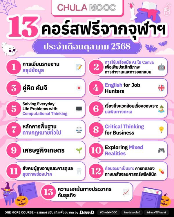 เริ่มต้นเดือนแบบนี้ One More Course วิ่งสับมาแชร์ 13 คอร์สเรียนฟรี ประจำเดือนตุลาคม 2568 โดย Chula MOOC จุฬาลงกรณ์มหาวิทยาลัย ที่รอบนี้ขนทัพคอร์สน่าเรียนมาให้ปลดล็อกสกิลกับแบบฉ่ำใจ ไม่ว่าจะเป็นการพัฒนาทักษะการทำงาน ภาษา การคิดวิเคราะห์ หรือจะเปิดโลกไปกับเทคโนโลยีและองค์ความรู้ร่วมสมัย ซึ่งล้วนมีประโยชน์ต่อการทั้งนั้น // กระซิบว่ารอบนี้มีคอร์ส Canva 2 สุดฮิตกลับมาด้วย ใครพลาดรอบก่อนต้องรีบเลย เพราะเขารับจำนวนจำกัดน้าา~