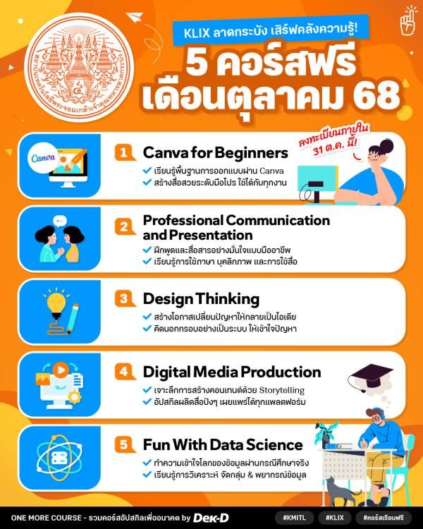 ขนทัพความรู้มาเสิร์ฟให้แบบจุกๆ! ล่าสุด สถาบันเทคโนโลยีพระจอมเกล้าเจ้าคุณทหารลาดกระบัง (KMITL) กลับมาพร้อมกับ 5 คอร์สออนไลน์เรียนฟรี บนแพลตฟอร์ม KLIX ประจำเดือนตุลาคม 2568 ที่คราวนี้มีทั้ง คอร์สออกแบบด้วยโปรแกรมตัวฮิตอย่าง Canva, ️การสื่อสารและนำเสนอแบบมือโปร, กระบวนการคิดเชิงออกแบบ, การผลิตสื่อดิจิทัล ไปจนถึงวิทยาการข้อมูลสุดล้ำ ใครอยากอัปสกิลสายครีเอทีฟ นักสื่อสาร หรือนักคิดวิเคราะห์ บอกเลยว่ามีประโยชน์มาก // แต่ละคอร์สจะมีรายละเอียดอะไรบ้าง ตามไปดูที่เราสรุปไว้พร้อมกันเลยยย~