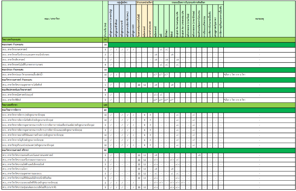 - คณะอุตสาหกรรมเกษตร สาขาวิชาเทคโนโลยีการบรรจุ, เทคโนโลยีชีวภาพ, เทคโนโลยีสิ่งทอและแฟชั่น, พัฒนาผลิตภัณฑ์อุตสาหกรรมเกษตร, วิทยาศาสตร์และเทคโนโลยีการอาหาร (ปกติ-พิเศษ)