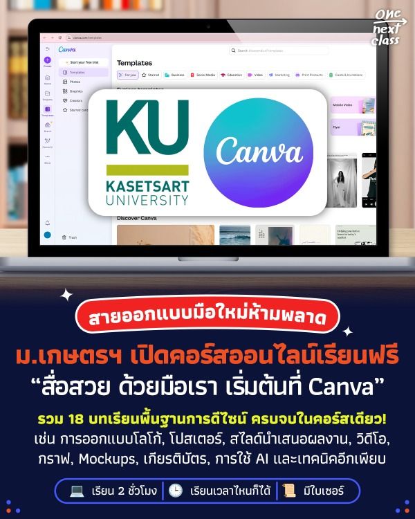 สายออกแบบมือใหม่ห้ามพลาด! KU MOOC จาก มหาวิทยาลัยเกษตรศาสตร์ เปิดคอร์สออนไลน์เรียนฟรี วิชา “สื่อสวย ด้วยมือเรา เริ่มต้นที่ Canva” บอกเลยว่าดีงามมากกกก เพราะเค้าสอนตั้งแต่พื้นฐานเหมือนจับมือทำ ได้ลองฝึกออกแบบสื่อหลากหลาย เช่น โลโก้ โปสเตอร์ งานนำเสนอ วิดีโอ กราฟ เกียรติบัตร การทำ Mockups และเทคนิคอีกมากมายที่จะช่วยให้เราครีเอตผลงานได้อย่างสร้างสรรค์และสะดวกมากขึ้น