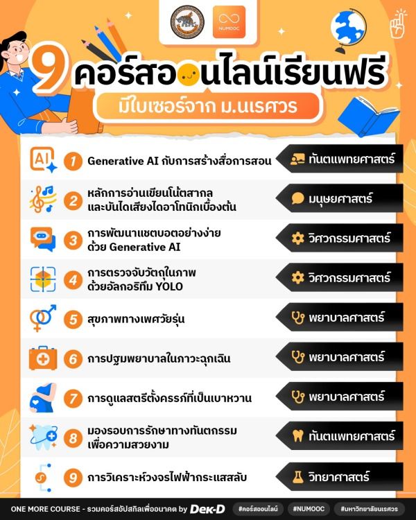 มอเทาแสด ไม่ได้มีแค่แดดและยุง แต่มีคอร์สออนไลน์ให้เรียนฟรีเพียบ! และแล้วก็ถึงคิวของ #มหาวิทยาลัยนเรศวร ที่เตรียมเสิร์ฟคอร์สเนื้อหาดีๆ ให้ upskill & reskill กันแบบจุใจ จัดมาให้ 9 วิชา หลากหลายสาย มีทั้งคอร์สสายเทคโนโลยี AI , ดนตรี , สุขภาพ และ วิศวกรรม ️รวมมาให้ครบจุใจ