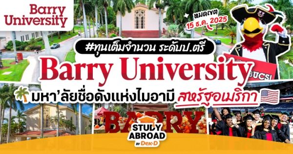 Hello ทักทายน้องๆ ชาว Dek-D ทุกคนค่า~ ไหนๆ ใครอยากไปเรียนต่อเมกากันบ้าง วันนี้พี่ลูกหมูมีทุนสุดพิเศษจากยูในฟลอริดามาแนะนำกันค่ะ นั่นก็คือ ‘Barry University’ มหา’ลัยเอกชนย่านไมอามี ที่มาพร้อมกับ ‘Stamps Scholars Program’ ซึ่งเป็นทุนเต็มจำนวน ครอบคลุมค่าเล่าเรียน ค่าที่พัก-อาหาร และยังมีเงินสนับสนุนพิเศษสำหรับการเรียนต่อต่างประเทศและทำวิจัยด้วยนะคะ