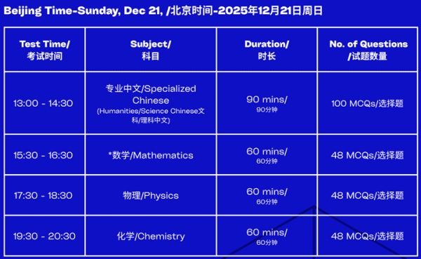 บทความนี้อ้างอิงข้อมูลจาก CSCA Complete Guide: China Scholastic Competency Assessment for Bachelor Degree Study in China (来华留学本科入学学业水平测试完整指南) เมื่อวันที่ 16 ต.ค. 2025 และยังมีข้อมูลบางส่วนที่รอประกาศเพิ่มเติม เช่น กำหนดการและขั้นตอนการลงทะเบียนรอบแรก ศูนย์สอบ เป็นต้น