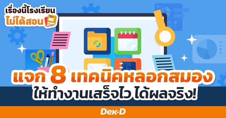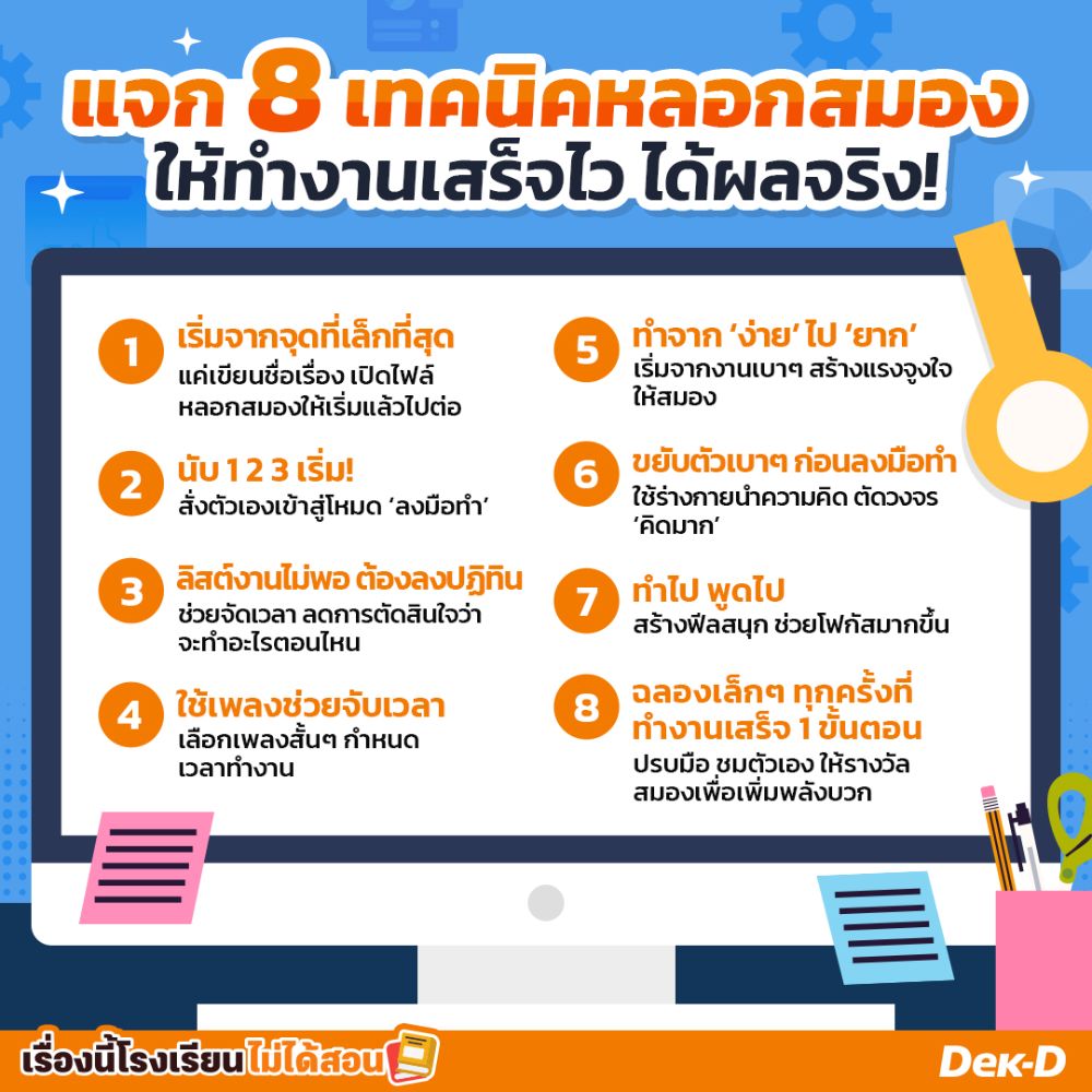 ข้อมูลจากhttps://www.verywellmind.com/expert-backed-productivity-hackshttps://medium.com/i-tried-7-weird-productivity-hacks-heres-what-workedเทคนิคนี้สามารถเอาไปปรับใช้ได้กับทุกอย่าง ทุกเพศ ทุกวัย ตั้งแต่น้องๆ วัยเรียนเรียน ทำการบ้าน ทำรายงาน อ่านหนังสือสอบ ไปจนถึงผู้ใหญ่วัยทำงาน ถ้ารู้สึกเนือยๆ นอยด์ๆ ไม่อยากทำอะไร ลองนำเคล็บลับนี้ไปใช้ ถึงจะดูแปลกๆ แต่ได้ผลแน่นอน!