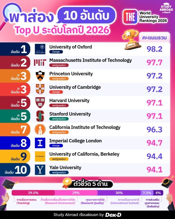สวัสดีครับชาว Dek-D วันนี้ พี่วุฒิ มีรายงานผลการจัดอันดับมหาวิทยาลัยทั่วโลก ประจำปี 2026 จาก THE World University Rankings 2026 ซึ่งจัดโดย Times Higher Education (THE) องค์กรสื่อและวิเคราะห์ข้อมูลด้านการศึกษาระดับโลกจากประเทศสหราชอาณาจักร