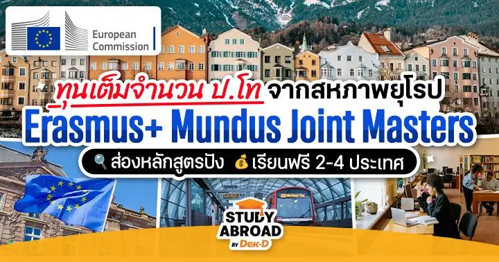 สวัสดีค่ะชาว Dek-D สำหรับใครที่เรียนจบ ป.ตรี หรือทำงานมาสักพัก แล้วเริ่มคิดอยากกลับไปเรียนอีกครั้ง หรือปลดล็อกสกิลเพื่อโอกาสเติบโตในสายงาน วันนี้เราอยากชวนมารู้จักทุนเรียนต่อยุโรปที่ได้รับความนิยมขึ้นเรื่อยๆ นั่นก็คือ "Erasmus+ Joint Masters Scholarship" ผู้ได้รับทุนจะได้เรียน ป.โท 1 โปรแกรม แต่ได้ย้ายประเทศเรียนหลายแห่งในยุโรปแบบฟรีตั้งแต่ต้นจนจบ พร้อมเปิดโลกการศึกษาใหม่แบบจัดเต็ม!