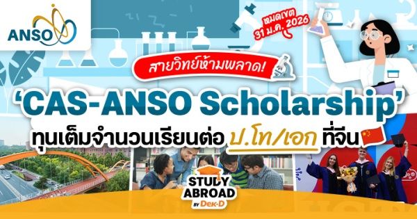 สวัสดีชาว Dek-D ทุกคนค่า~ ประเทศจีนนับเป็นมหาอำนาจฝั่งเอเชียที่ทุ่มงบให้กับด้านวิทยาศาสตร์และเทคโนโลยีมากเป็นอับดับต้นๆ ของโลก และสำหรับชาวสายวิทย์คนไหนที่สนใจอยากศึกษาและทำงานวิจัย ณ สถาบันวิทยาศาสตร์ชั้นนำของจีน ข่าวดีคือตอนนี้มี #ทุนเต็มจำนวน ‘CAS-ANSO Scholarship’ จาก The Alliance of International Science Organizations in the Belt and Road Region (ANSO) กำลังเปิดรับสมัครนักศึกษาต่างชาติ เพื่อเข้าศึกษาต่อระดับ ปริญญาโท/ปริญญาเอก ประจำปี 2026