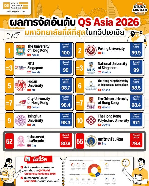 สำหรับน้องๆ ที่อยากอ่านรายละเอียดการจัดอันดับครั้งนี้เพิ่มเติม สามารถศึกษาได้ที่เว็บไซต์ https://www.qs.com/insights/qs-world-university-rankings-asia ได้เลยนะครับ