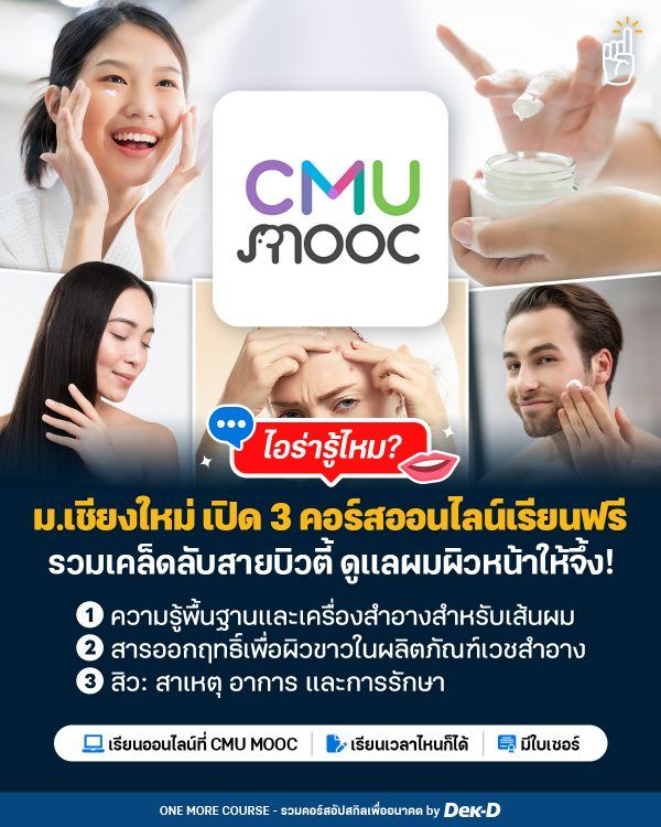 ใกล้ New Year แล้วใครอยากดูแลตัวเองให้เป็น New You รีบตาม One More Course มาทางนี้เลย เพราะเราจะมาชี้เป้า 3 คอร์สออนไลน์เรียนฟรี #สายบิวตี้ จาก มหาวิทยาลัยเชียงใหม่ ที่บอกเลยว่าจัดเต็มเคล็ดลับดูแลทั้ง #ผม #ผิว #หน้า เนื้อหาแน่นแต่เข้าใจง่าย อิงหลักวิทยาศาสตร์สุขภาพที่ช่วยให้เราดูดีจากภายในสู่ภายนอก // ใครอยากเพิ่มออร่า บูสต์ความมั่นใจให้ตัวเอง ตามไปเช็กรายละเอียดการลงทะเบียนแต่ละคอร์สด้านล่างเลยยย~
