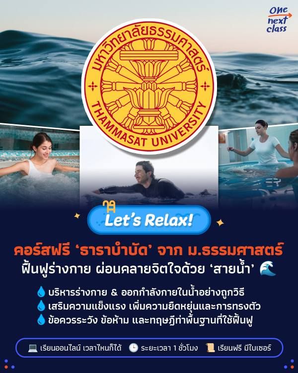 รีบตามมาหาคำตอบได้ในวิชา ‘ธาราบำบัดเบื้องต้น (Basic Hydrotherapy) - ภาคทฤษฎี’ คอร์สออนไลน์จาก มหาวิทยาลัยธรรมศาสตร์ ที่เปิดให้ทุกคนเรียนฟรี ไม่มีค่าใช้จ่าย แถมเรียนจบมี Certificate ให้ด้วยนะ~