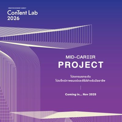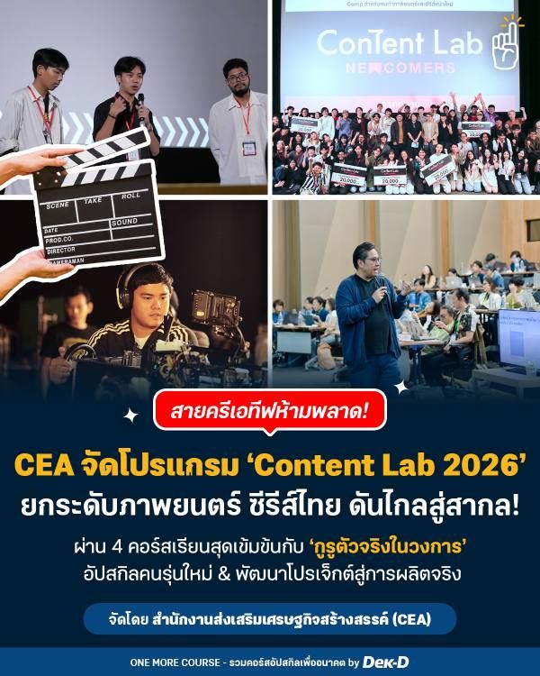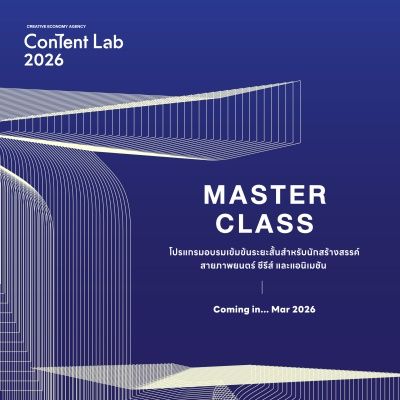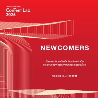‘สำนักงานส่งเสริมเศรษฐกิจสร้างสรรค์’ (CEA) เตรียมคัมแบคปีที่ 4 พร้อมเปิดรับสมัครโครงการอบรม Content Lab 2026 คอร์สเรียนสุดเข้มข้นจากวิทยากรผู้เชี่ยวชาญในวงการ เพื่อพัฒนาโปรเจกต์สู่การผลิตจริง โดยมุ่งมั่นพัฒนาศักยภาพและยกระดับผลงานของนักสร้างสรรค์ไทยให้เฉิดฉายในเวทีระดับนานาชาติ