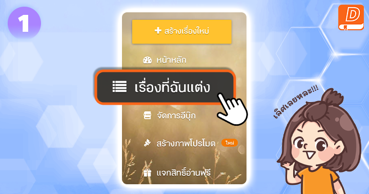 - ไปที่หน้าสร้างผลงาน หรือ คลิก เลือกนิยายที่เมนู “เรื่องที่ฉันแต่ง”
