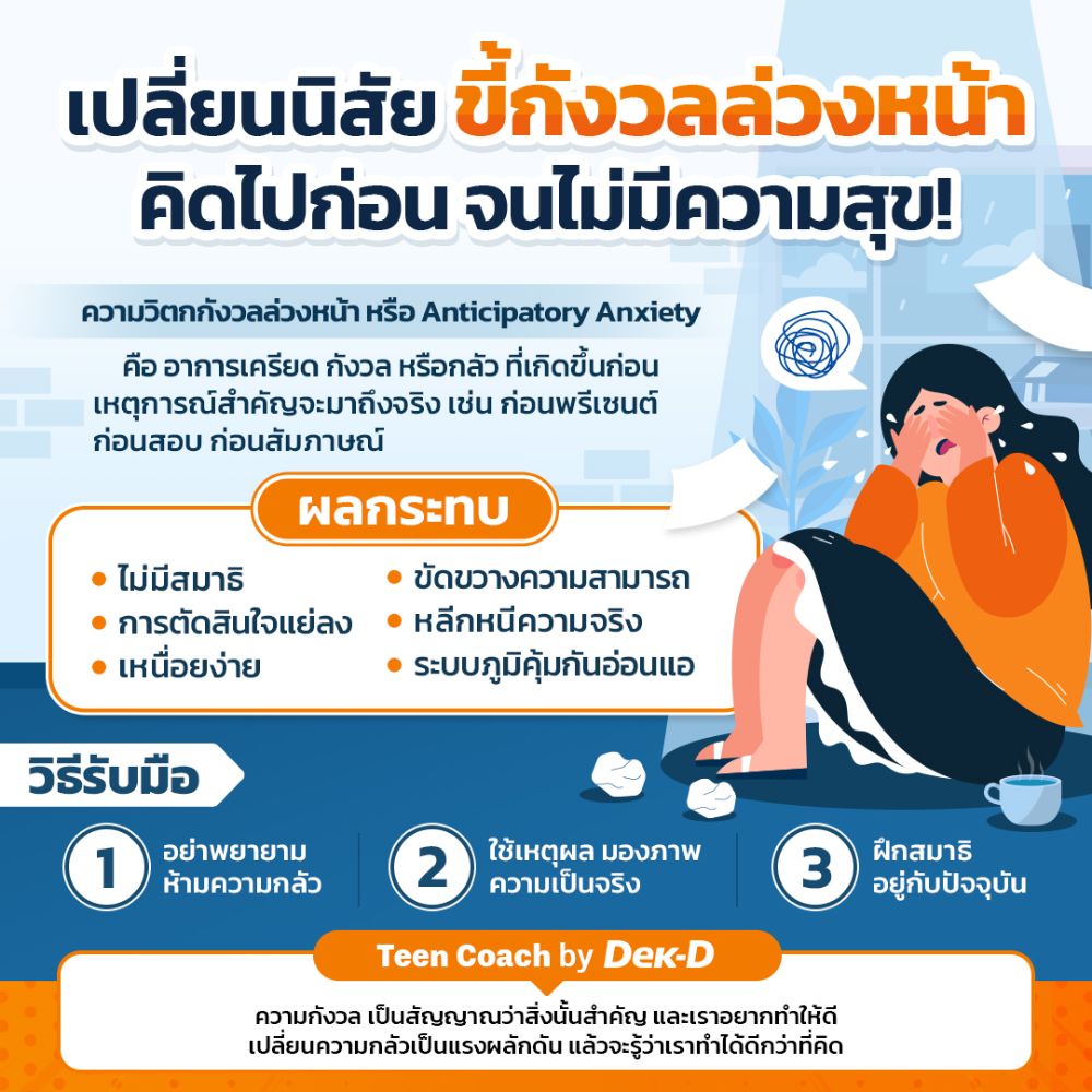 Anticipatory Anxiety คือ อาการวิตกกังวลที่เกิดขึ้นก่อนเหตุการณ์จะมาถึง เช่น ก่อนขึ้นพูดในที่สาธารณะ ก่อนการสอบ หรือก่อนเริ่มงานใหม่ รู้สึกกลัวว่าทุกอย่างจะผิดพลาด ทั้งที่เหตุการณ์ยังไม่เกิดขึ้นจริง ความคิดลบ ๆ กับเหตุการณ์ เช่น ถ้าพูดผิดจะทำยังไง หรือ เพื่อนจะหัวเราะไหมถ้าเราตอบไม่ได้ มักหมุนวนในหัวไม่หยุด จนทำให้ร่างกายตอบสนอง มีอาการหัวใจเต้นแรง เหงื่อออก มือเย็น นอนไม่หลับ และไม่มีสมาธิ