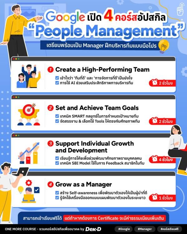 ‘ผู้นำที่ดี’ ไม่ใช่แค่คนที่พาทีมเดินหน้า แต่จะต้องเข้าใจและเป็นแบบอย่างให้ทีมเติบโตไปพร้อมกันด้วย! วันนี้ One More Course ขอมาป้ายยาหลักสูตรเนื้อหาดีๆ จาก Google Career Certificates ซึ่งจัดชุดคอร์สเรียน “Google People Management Essentials Specialization” ที่จะมาช่วย upskill เตรียมความพร้อมเพื่อเป็น People Manager ในยุคใหม่ได้อย่างมั่นใจและเป็นมืออาชีพมากขึ้น!