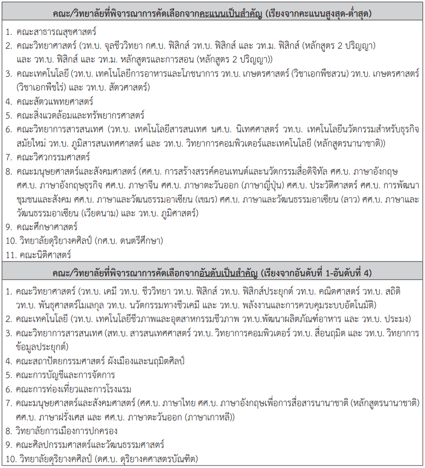 *เงื่อนไขการคัดเลือก มีกลุ่มคณะ 2 ประเภทคือ กลุ่มที่ 1 คณะที่พิจารณาคะแนนเป็นสำคัญ คือเรียงคะแนนจากสูงสุด-ต่ำสุด และกลุ่มที่ 2 คณะที่พิจารณาจากอันดับเป็นสำคัญ คือเรียงอันดับ 1-4