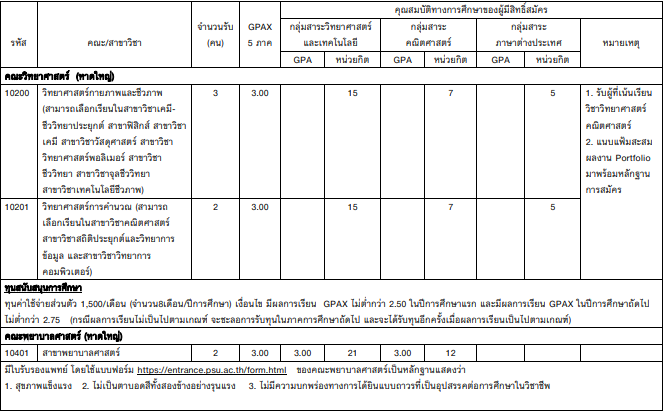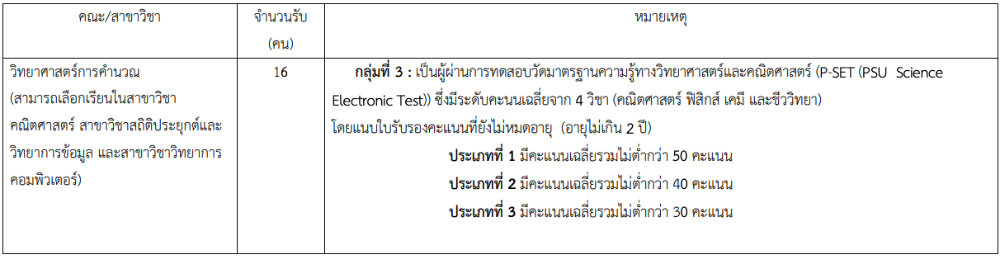 - คณะวิศวกรรมศาสตร์ วิทยาเขตหาดใหญ่ รับรวมกัน 30 ที่นั่ง