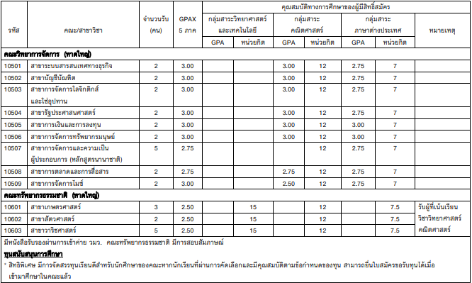 - มี GPAX 5 เทอม > 3.00 และมี GPA คณิตศาสตร์และภาษาต่างประเทศ กลุ่มสาระละไม่ต่ำกว่า 3.00