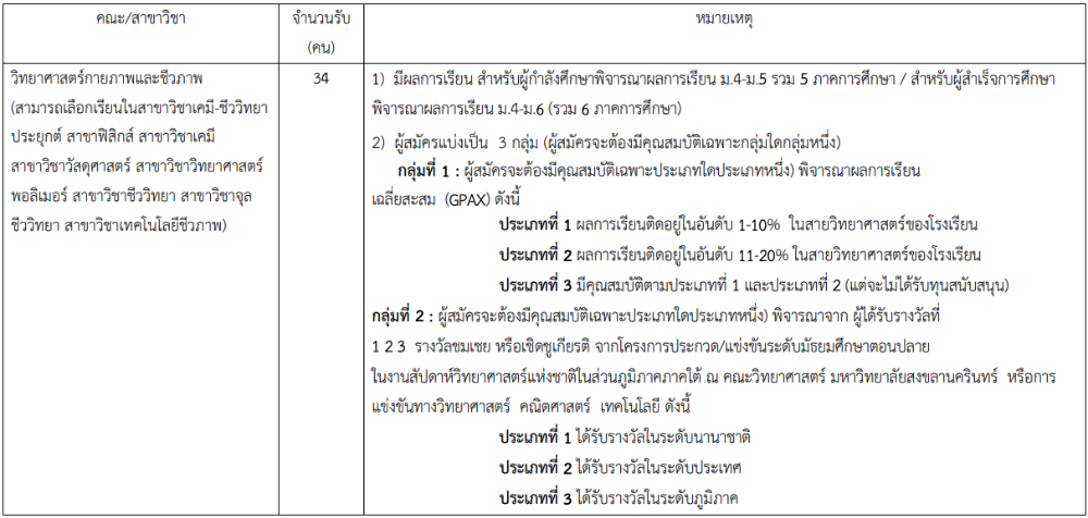 - สาขาวิชาชีววิทยา 1 ที่นั่ง